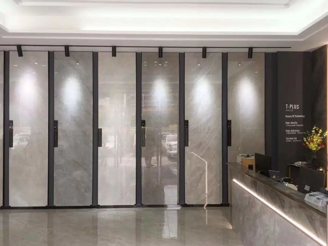 龙游国际轻奢馆,在设计时选用时下流行的黑白灰色系和大规格产品上样,直铺到顶,展现不同工艺、不同规格、不同质感的产品,让消费者一目了然!